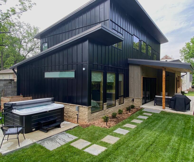 Bike House 1 is a 3BR, 2.5BA modern retreat with direct access to Slaughter Pen Trail. Located across from the Tech Hub connector, it’s ideal for cyclists and outdoor lovers. Features include a hot tub, sauna, and wall-to-wall windows with wooded views. Enjoy a stocked kitchen, 85" Smart TV, and high-end finishes. Just one mile from Downtown Bentonville and Crystal Bridges. Includes bike wash station, repair stand, EV charger, 2-car garage, and a covered patio with Weber grill.