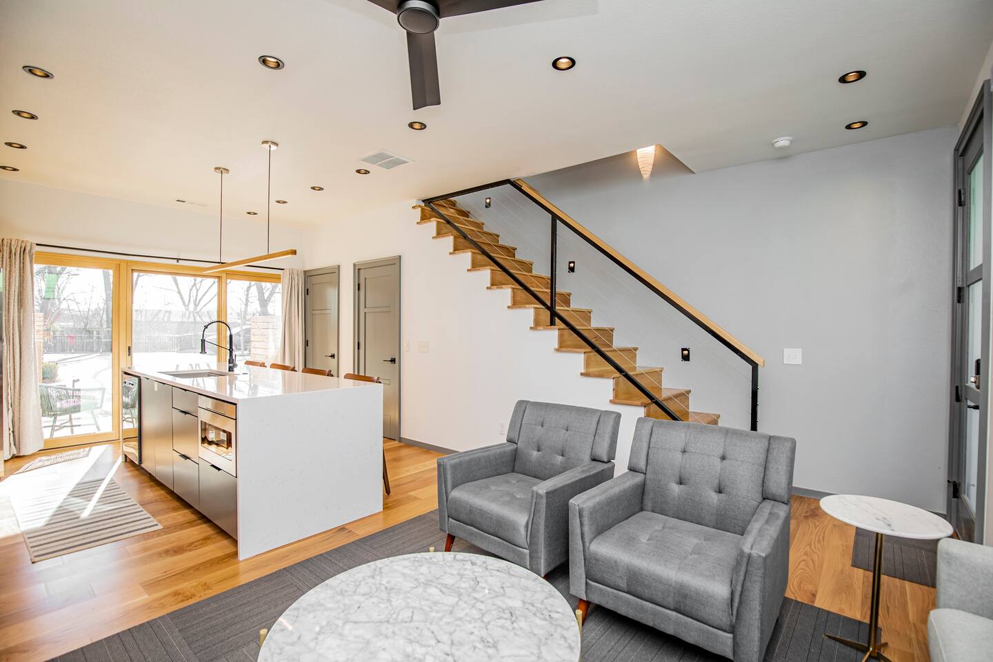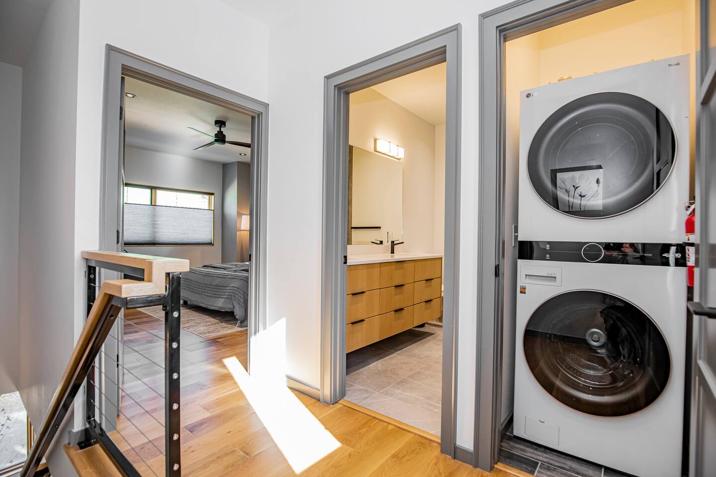 Freshly Constructed townhome located in the heart of Downtown Bentonville. Well equipped and crisp with modern finishes and comfortable furnishings. Plentiful Natural light throughout from tall windows and glass doors. Floor Level Patio access through sliding glass doors Open-format living, kitchen, dining area with modern finishes and high end appliances. -80” Flatscreen Smart TV in the living area. Dining for 4 at the kitchen quartz island Fully Stocked Kitchen includes: - refrigerator with ice maker - 4-burner glass top stove - microwave - dishwasher - Keurig coffee maker with complimentary coffee pods - ample plates, bowls, and saucers - mugs, water glasses, and wine glasses - pots and pans - knives and silverware - cutting board - corkscrew, can opener, and kitchen shears/scissors - oil, salt, and pepper Floor 2: Bedroom 1 is on the 2nd floor and has a Queen-size bed, closet and private bath in the hall. Second Floor bathroom is located in the hall and has a shower/tub combo. Floor 3: Bedroom 2 is on the 3rd floor and has a King-size bed, dresser, closet, a Smart TV, and private bath in the hall Third Floor bathroom is located in the hall and has a walk-in shower. Laundry closet with stacked, full-sized washer and dryer. OUTDOORS Private Patio with seating for 2 Bike stand and access to hose wash off area Curated landscaping and street view seating area in front