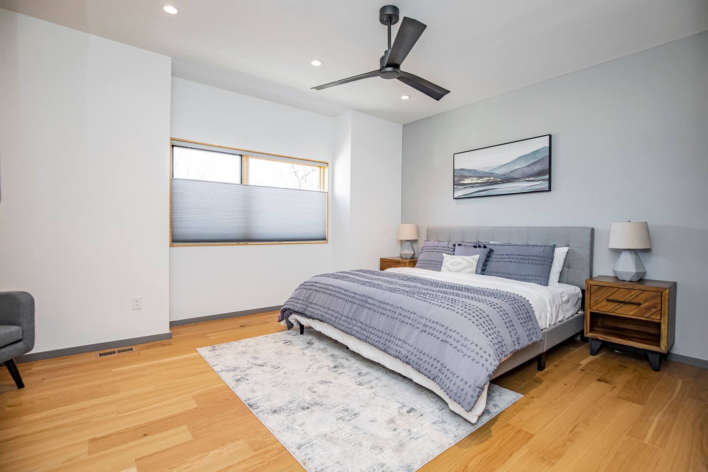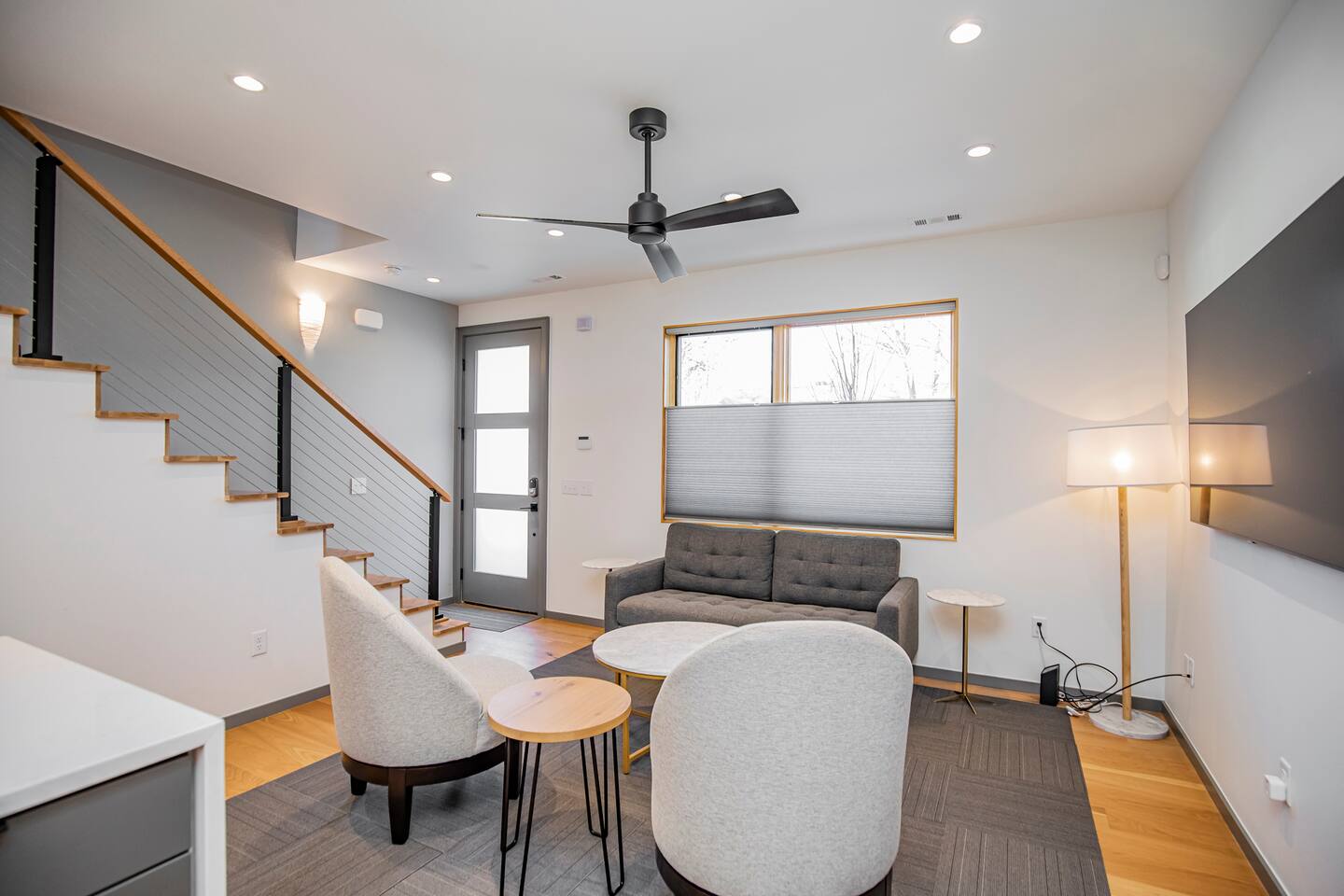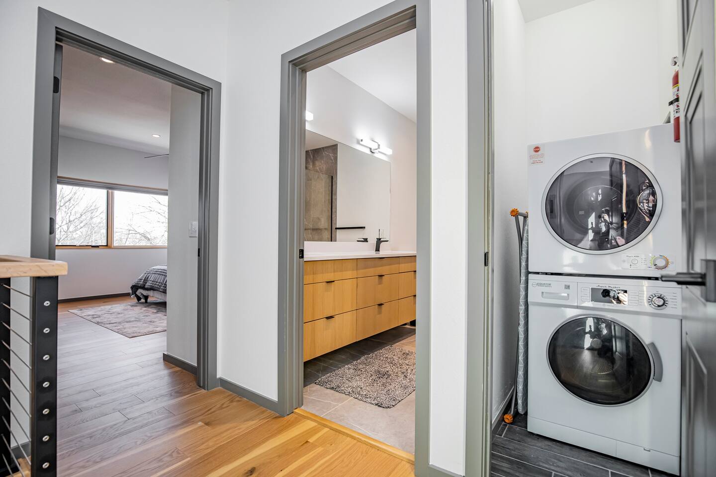 Freshly Constructed townhome located in the heart of Downtown Bentonville between the Downtown Square and The Momentary. Well equipped and crisp with modern finishes and comfortable furnishings. Plentiful Natural light throughout from tall windows and glass doors. Floor Level Open-format living, kitchen, dining area with sliding doors leading to patio and back parking lot. Utility closet -80” Flatscreen Smart TV in the living area. Dining for 3 at the kitchen quartz island Fully Stocked Kitchen includes: - refrigerator with ice maker - 4-burner glass top stove - microwave - dishwasher - Keurig coffee maker with complimentary coffee pods - ample plates, bowls, and saucers - mugs, water glasses, and wine glasses - pots and pans - knives and silverware - cutting board - corkscrew, can opener, and kitchen shears/scissors - oil, salt, and pepper Floor 2: Bedroom 1 is on the 2nd floor and has a Queen-size bed, closet and private bath in the hall. Second Floor bathroom is located in the hall and has a shower/tub combo. Floor 3: Bedroom 2 is on the 3rd floor and has a King-size bed, dresser, closet, a Smart TV, and private bath in the hall Third Floor bathroom is located in the hall and has a walk-in shower. Laundry closet with stacked, full-sized washer and dryer. OUTDOORS Back door exit to parking lot. Bike stand and access to hose wash off area Curated landscaping and street view seating area in front