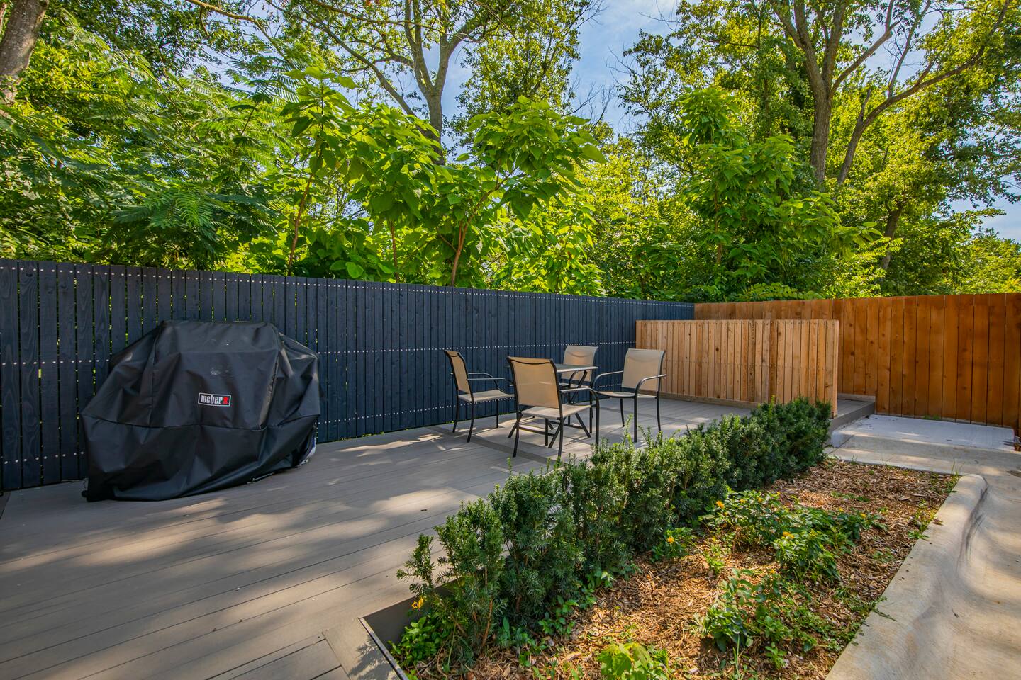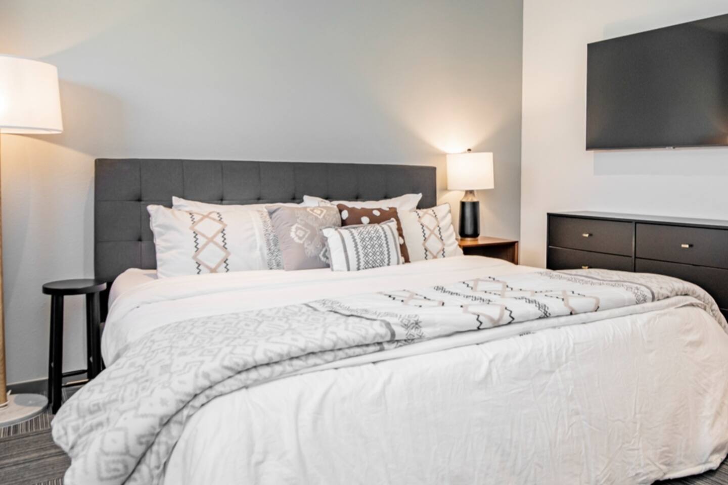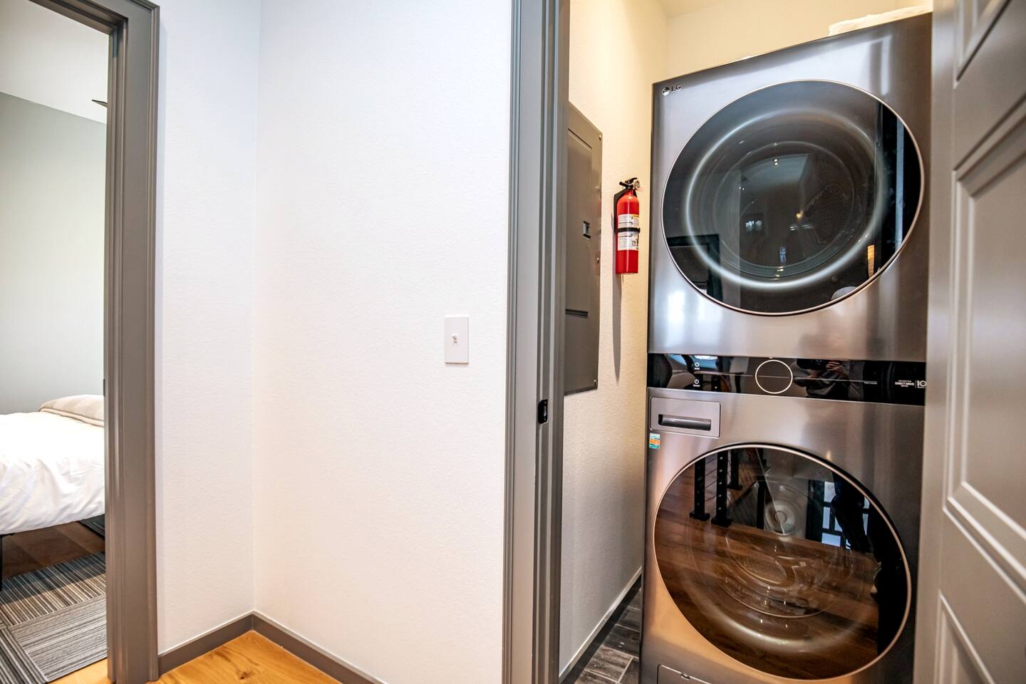 Freshly Constructed townhome located in the heart of Downtown Bentonville. Well equipped and crisp with modern finishes and comfortable furnishings. Plentiful Natural light throughout from tall windows and glass doors. Floor Level Open-format living, kitchen, dining area with sliding doors leading to patio and back parking lot. Guest Bathroom with sink and toilet Walk-in storage closet -80” Flatscreen Smart TV in the living area. Dining for 4 at the kitchen quartz island Fully Stocked Kitchen includes: - refrigerator with ice maker - 4-burner glass top stove - microwave - dishwasher - Keurig coffee maker with complimentary coffee pods - ample plates, bowls, and saucers - mugs, water glasses, and wine glasses - pots and pans - knives and silverware - cutting board - corkscrew, can opener, and kitchen shears/scissors - oil, salt, and pepper Floor 2: Laundry closet with stacked, full-sized washer and dryer. Bedroom 1 is on the 2nd floor and is complete with a King-size bed, dresser, closet, a Smart TV, and private bath in the hall. Bedroom 2 is on the 2nd floor and has a Queen-size bed, closet and private bath in the hall. Second Floor bathroom is located in the hall and has a shower/tub combo. OUTDOORS Private patio area with 2 outdoor chairs and end table Bike stand and access to hose wash off area Curated landscaping and street view seating area in front