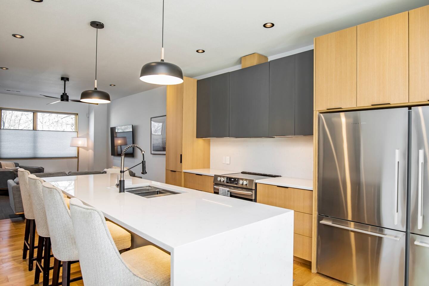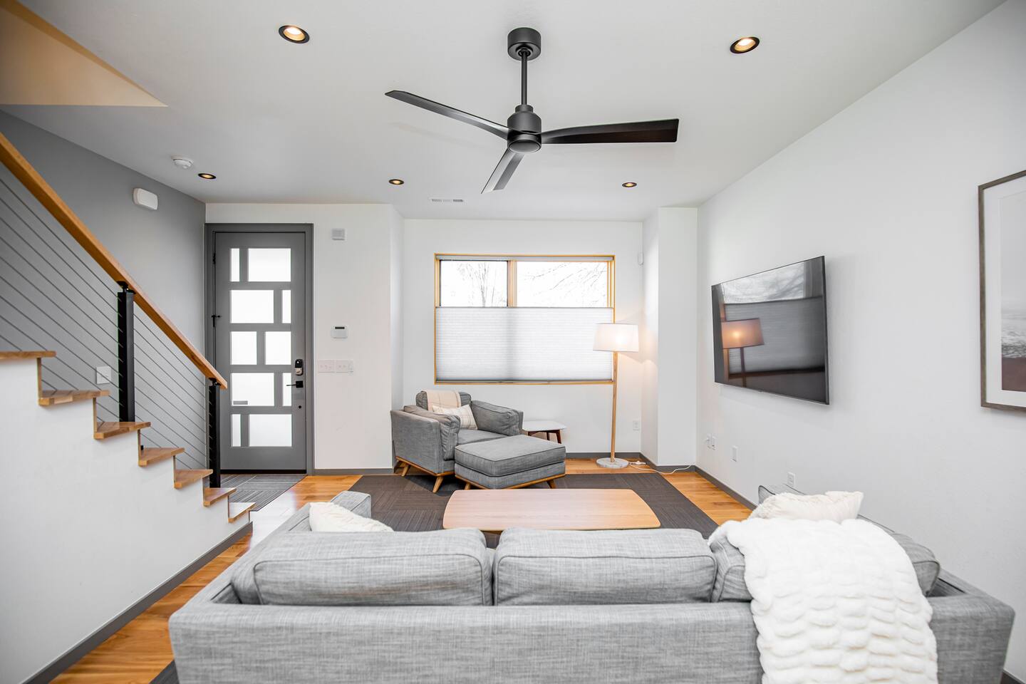 Modern townhome conveniently situated between the Momentary and Downtown Square. 3 minute bike or car ride to Square, restaurants, shopping and main MTB trailhead or 6 minute walk to The Momentary. Self check-in - smart locks 2 bedroom | 2 bathroom 1 king bed and 1 queen bed Fully stocked kitchen with high-end appliances W & D WIFI 80 in. 4K TV/ living room 55 in. 4K TV/ master BR Private parking lot in rear Designated on street public parking on SE 7th Bike clean off area