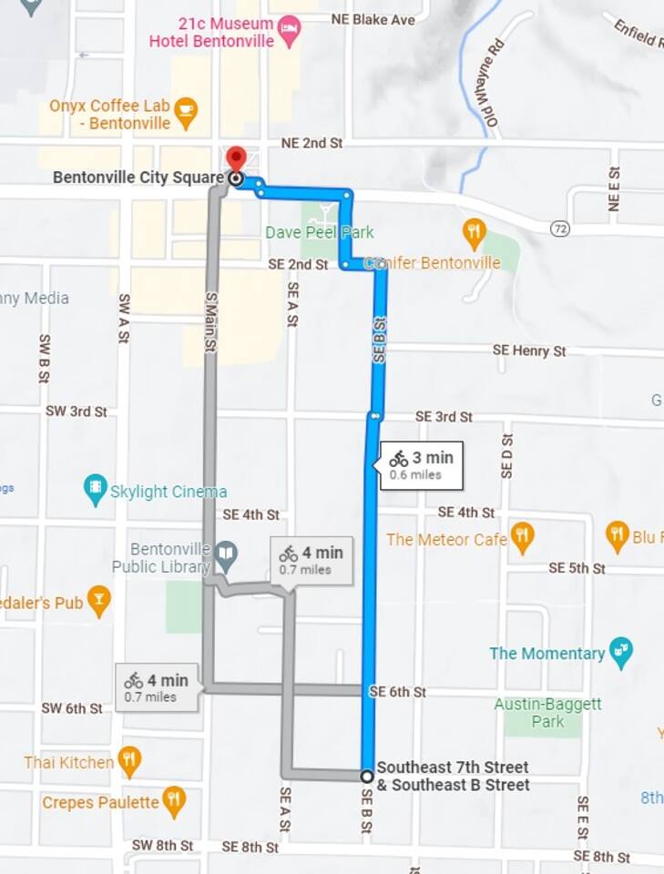 Located 6 blocks south of the Downtown Square (0.8 miles). Uncongested corner of Downtown Bentonville -- close to everything! Downtown streetscapes with townhomes and newly built row homes. 0.3 miles to the Momentary or the 211 Cafe and coffee shop.