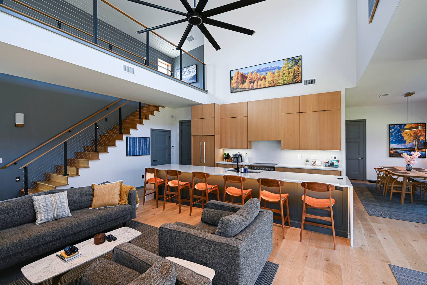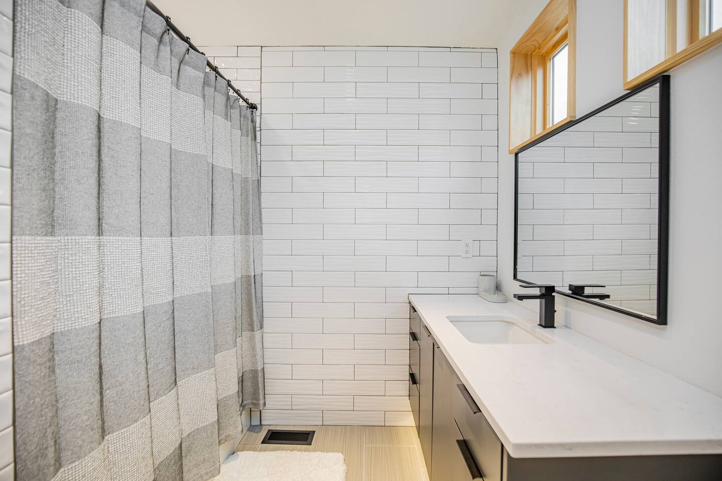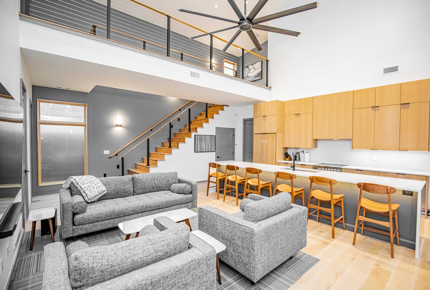 Bike House 1 is a 3-bedroom, 2.5-bath modern home designed for cyclists and outdoor-focused guests. The main floor includes a spacious living room with an 85" TV, a full kitchen with a walk-in pantry, dining area, and a king suite with an ensuite bathroom. Upstairs, there are two additional bedrooms—one with a king bed and one with a queen—plus a shared full bath. Each bedroom features a 65" Smart TV and wooded trail views. Outside, guests enjoy a covered patio with seating and a Weber grill, a 6-person hot tub, and a sauna. The garage includes a bike repair stand, EV charger, and space for two vehicles. There's also an outdoor bike wash station for cleaning gear after a day on the trails. Located directly across from the Tech Hub connector on Slaughter Pen Phase 3, this home offers direct trail access, modern comfort, and a quiet wooded setting just one mile from Downtown Bentonville and Crystal Bridges.