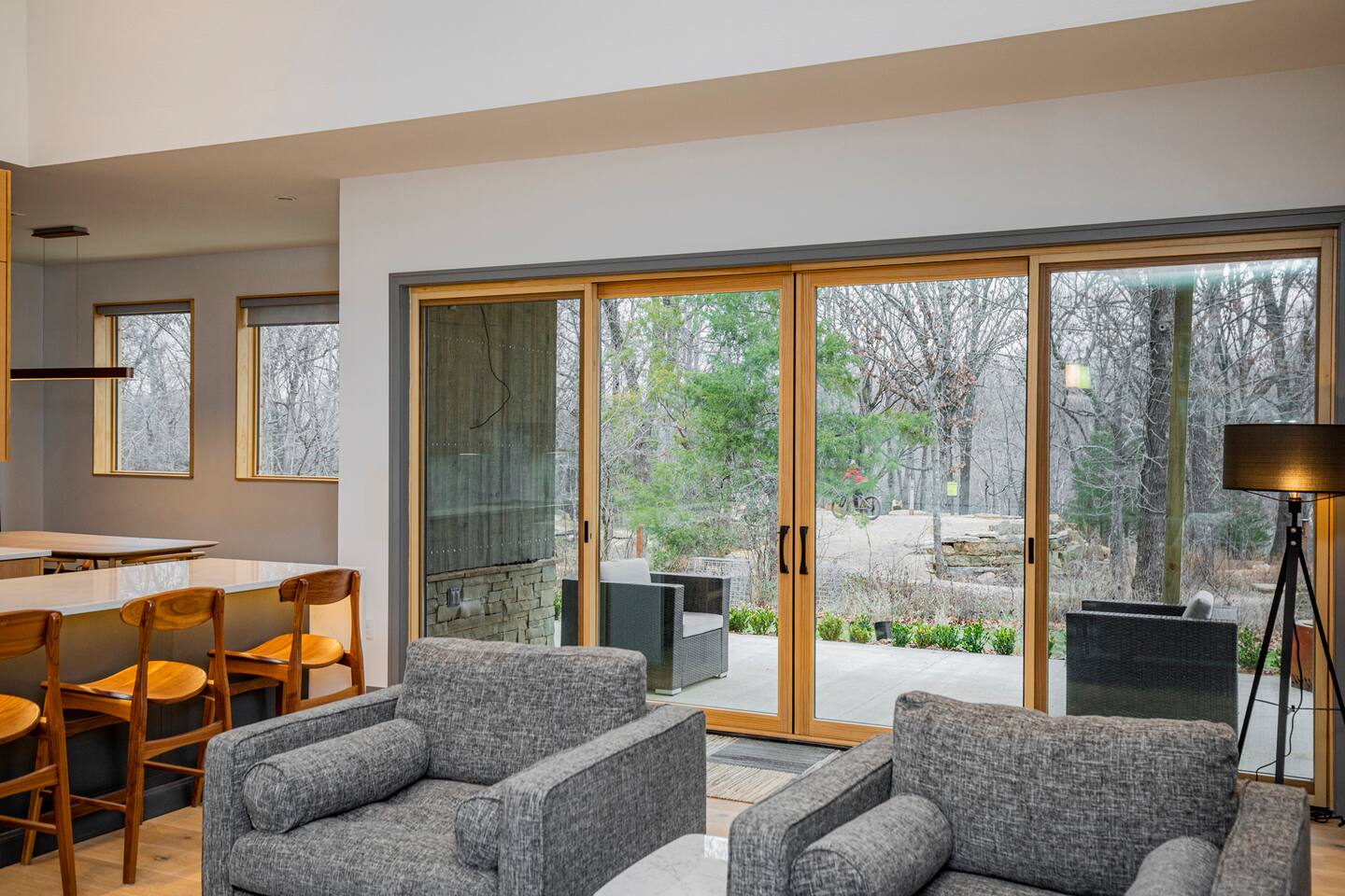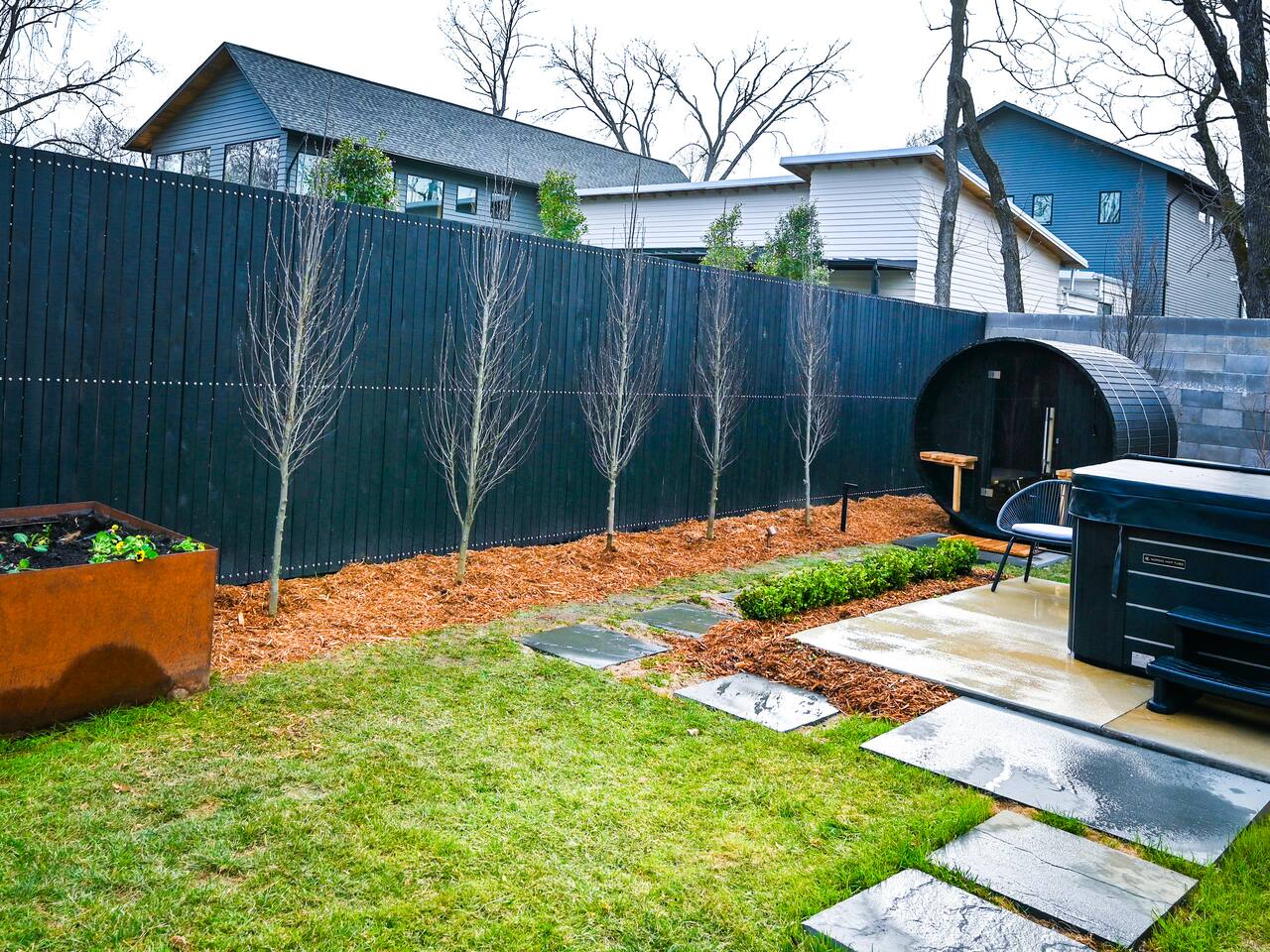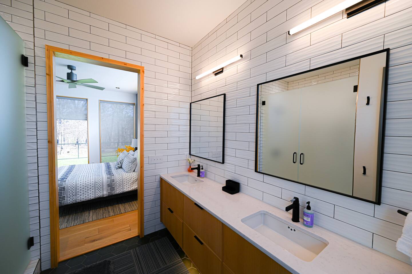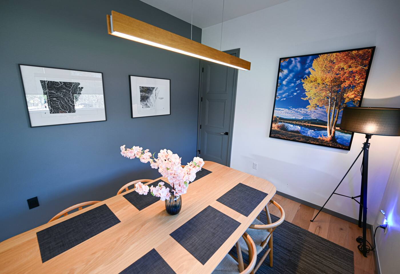 All three bedrooms overlook the wooded trail system. The home includes a six-person hot tub, covered patio with grill, and direct access to Slaughter Pen via the Tech Hub connector. There’s a bike wash area outside and a repair stand in the garage. The backyard is just 30 feet from the trail, with frequent deer and bird sightings. You’re one mile from the Bentonville Square, 1.1 miles to Crystal Bridges, and near the Razorback Greenway and 8th Street Market.