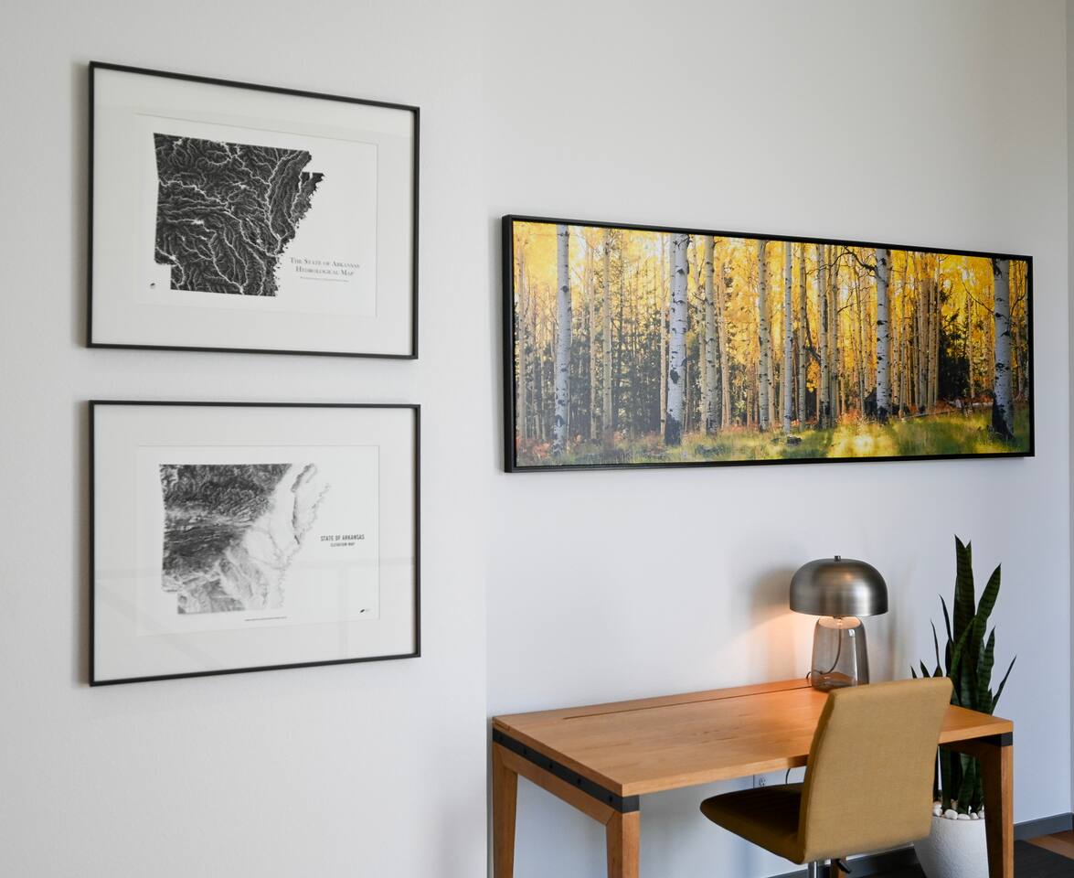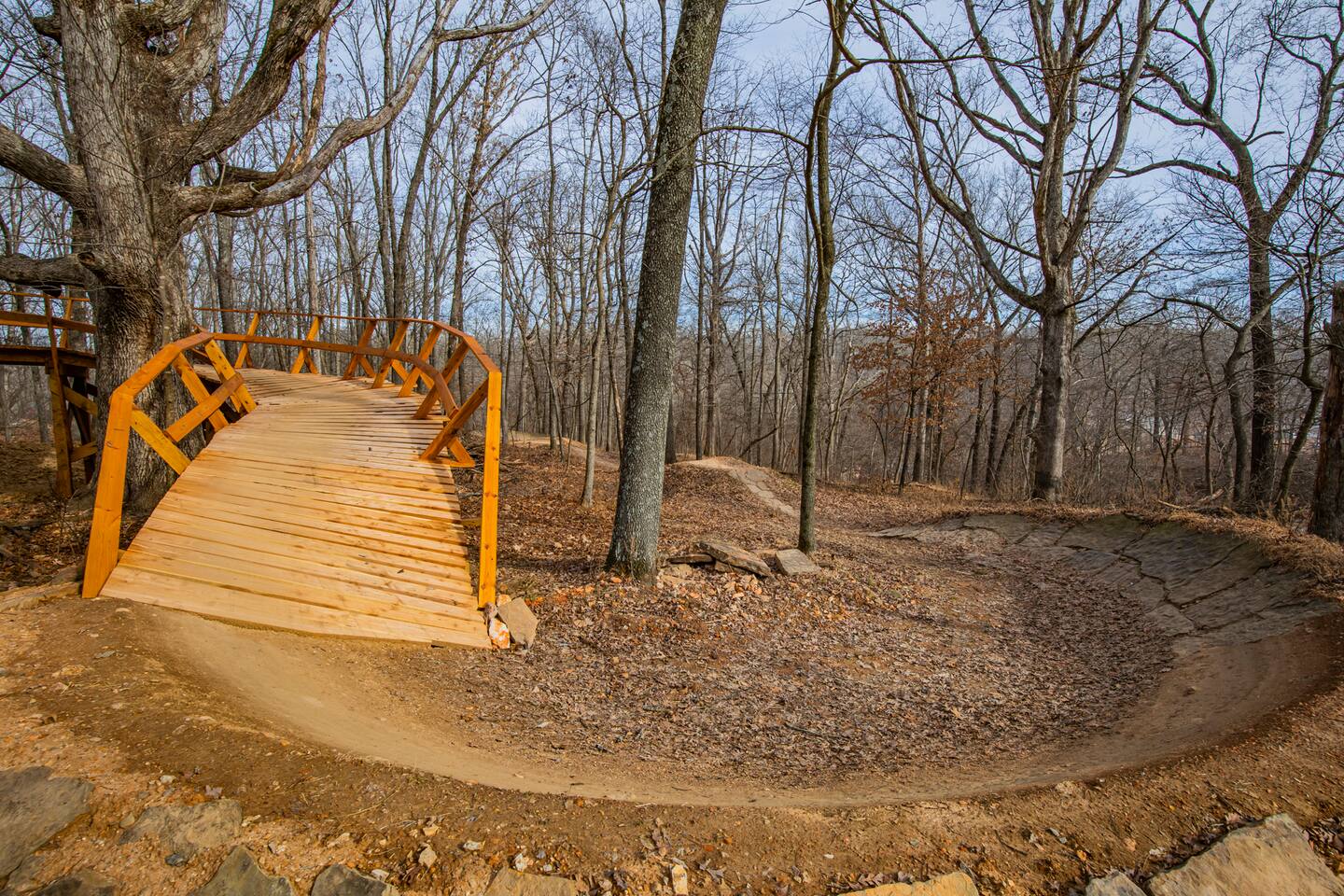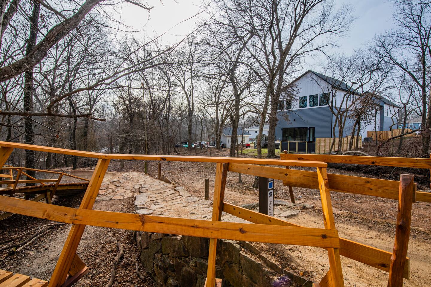 Paved and mountain biking trails crisscross quiet, downtown area streets. Ample mature trees and pocket views of Crystal Bridges Museum of American Art.