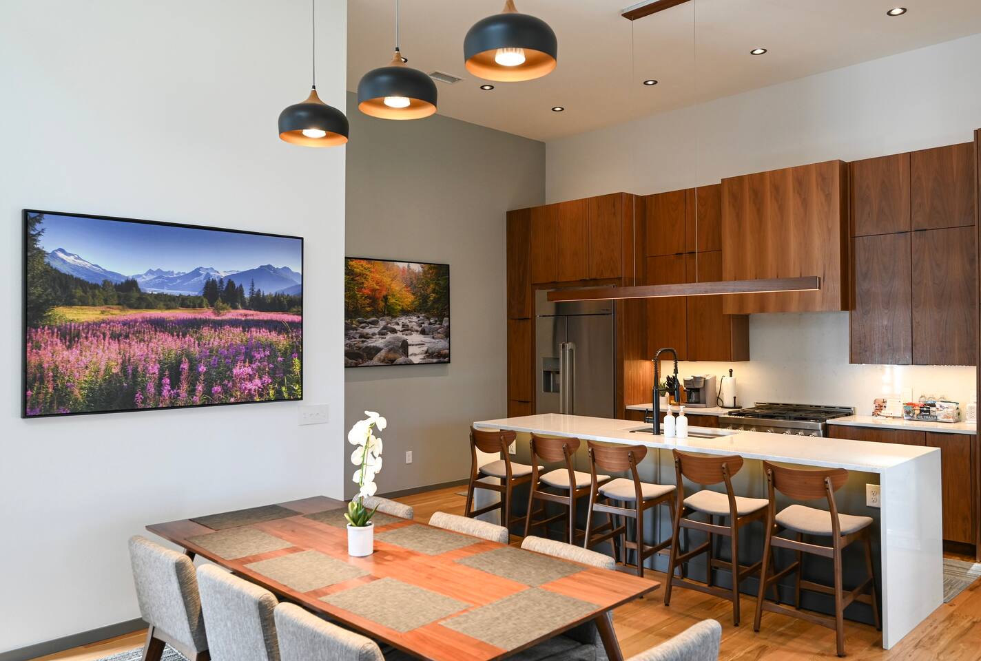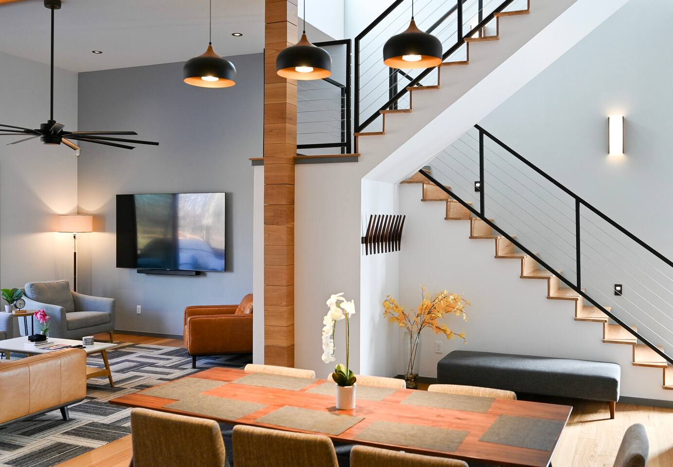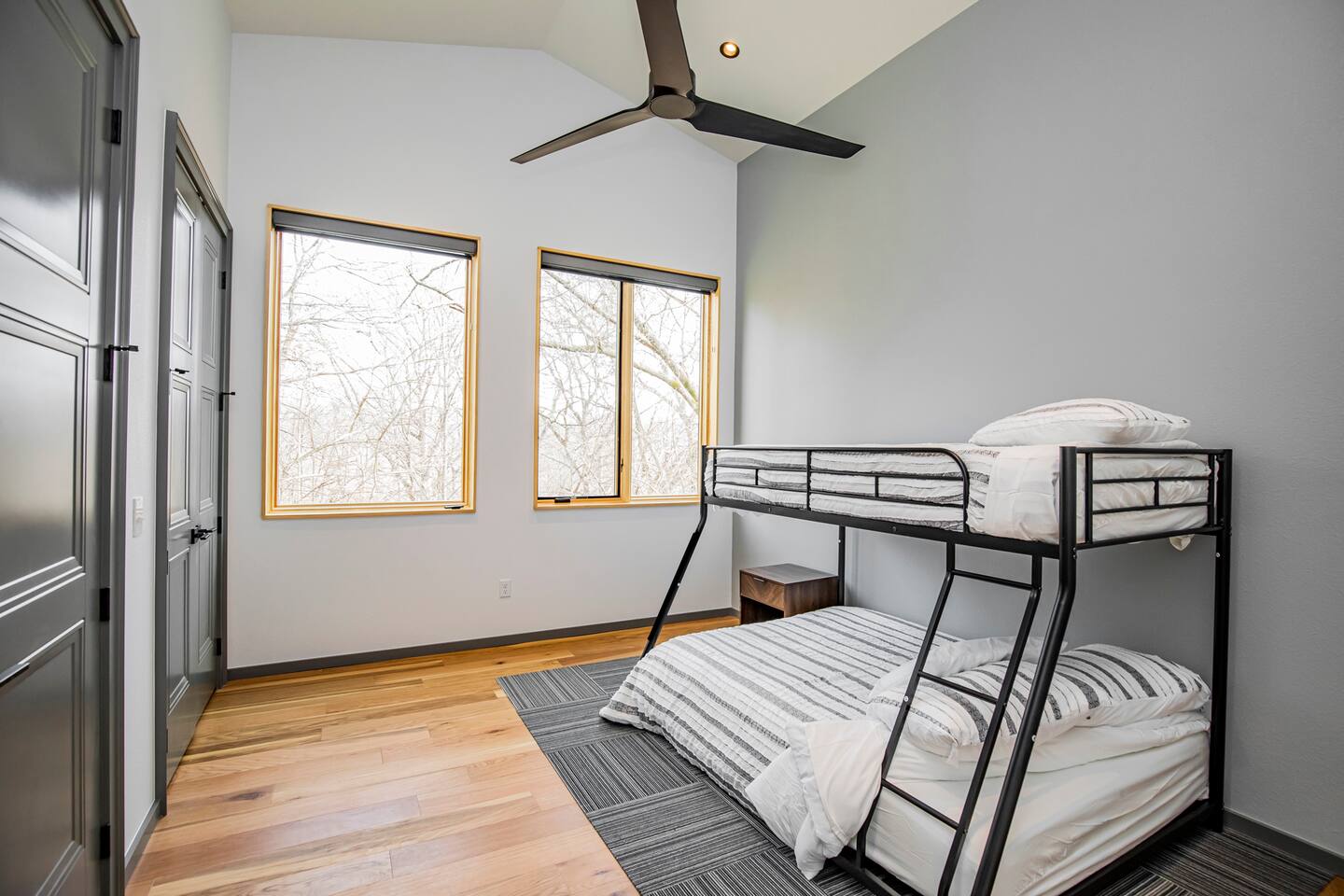 Bike House 2 is a 4-bedroom, 3.5-bath home designed for riders, families, and extended stays. The main floor includes a spacious living area, dining space, and a fully stocked kitchen featuring a 36" gas chef’s stove, 48" refrigerator, large island, and all the essentials for cooking and entertaining. A 16-foot wide glass door opens fully to the rear deck—blending indoor living with trail views. Upstairs, the primary suite features a king bed, ensuite bath, wooded views, and an 85" Smart TV. Two additional bedrooms also feature king beds—each with their own full bathroom and 65" Smart TV. The fourth bedroom includes twin bunk beds along with toys, books, and children’s items. The home also includes a full-size washer and dryer, located near the bedrooms for easy access during longer stays. The rear deck includes two chairs, a couch, and a dining table overlooking the trail—perfect for relaxing or enjoying meals while watching cyclists and local deer. The 2-car garage includes an EV charger and bike repair stand, with a hose-down station located outside. With direct trail access and a quiet location just minutes from Downtown Bentonville and Crystal Bridges, Bike House 2 is built for comfort, adventure, and convenience.