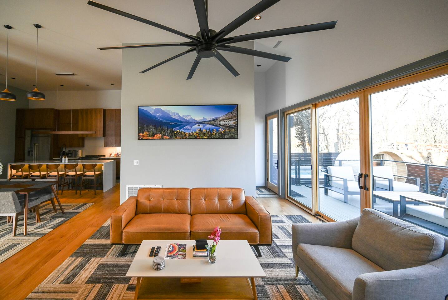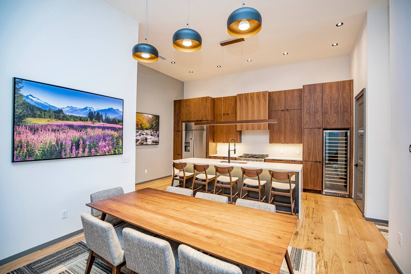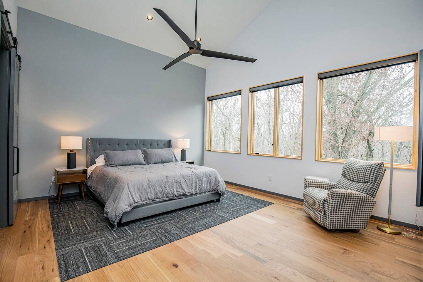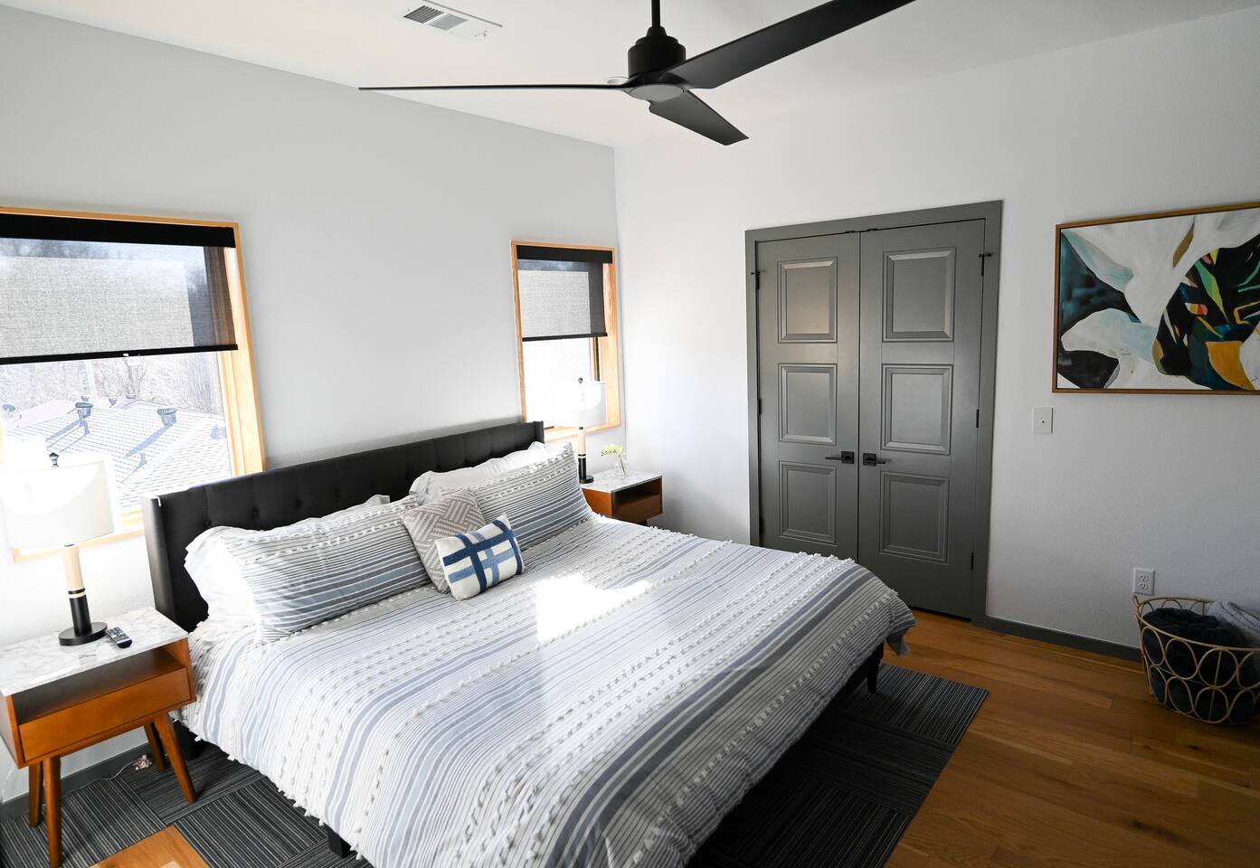 Bike House 2 is a 4-bedroom, 3.5-bath home designed for riders, families, and extended stays. The main floor includes a spacious living area, dining space, and a fully stocked kitchen featuring a 36" gas chef’s stove, 48" refrigerator, large island, and all the essentials for cooking and entertaining. A 16-foot wide glass door opens fully to the rear deck—blending indoor living with trail views. Upstairs, the primary suite features a king bed, ensuite bath, wooded views, and an 85" Smart TV. Two additional bedrooms also feature king beds—each with their own full bathroom and 65" Smart TV. The fourth bedroom includes twin bunk beds along with toys, books, and children’s items. The home also includes a full-size washer and dryer, located near the bedrooms for easy access during longer stays. The rear deck includes two chairs, a couch, and a dining table overlooking the trail—perfect for relaxing or enjoying meals while watching cyclists and local deer. The 2-car garage includes an EV charger and bike repair stand, with a hose-down station located outside. With direct trail access and a quiet location just minutes from Downtown Bentonville and Crystal Bridges, Bike House 2 is built for comfort, adventure, and convenience.