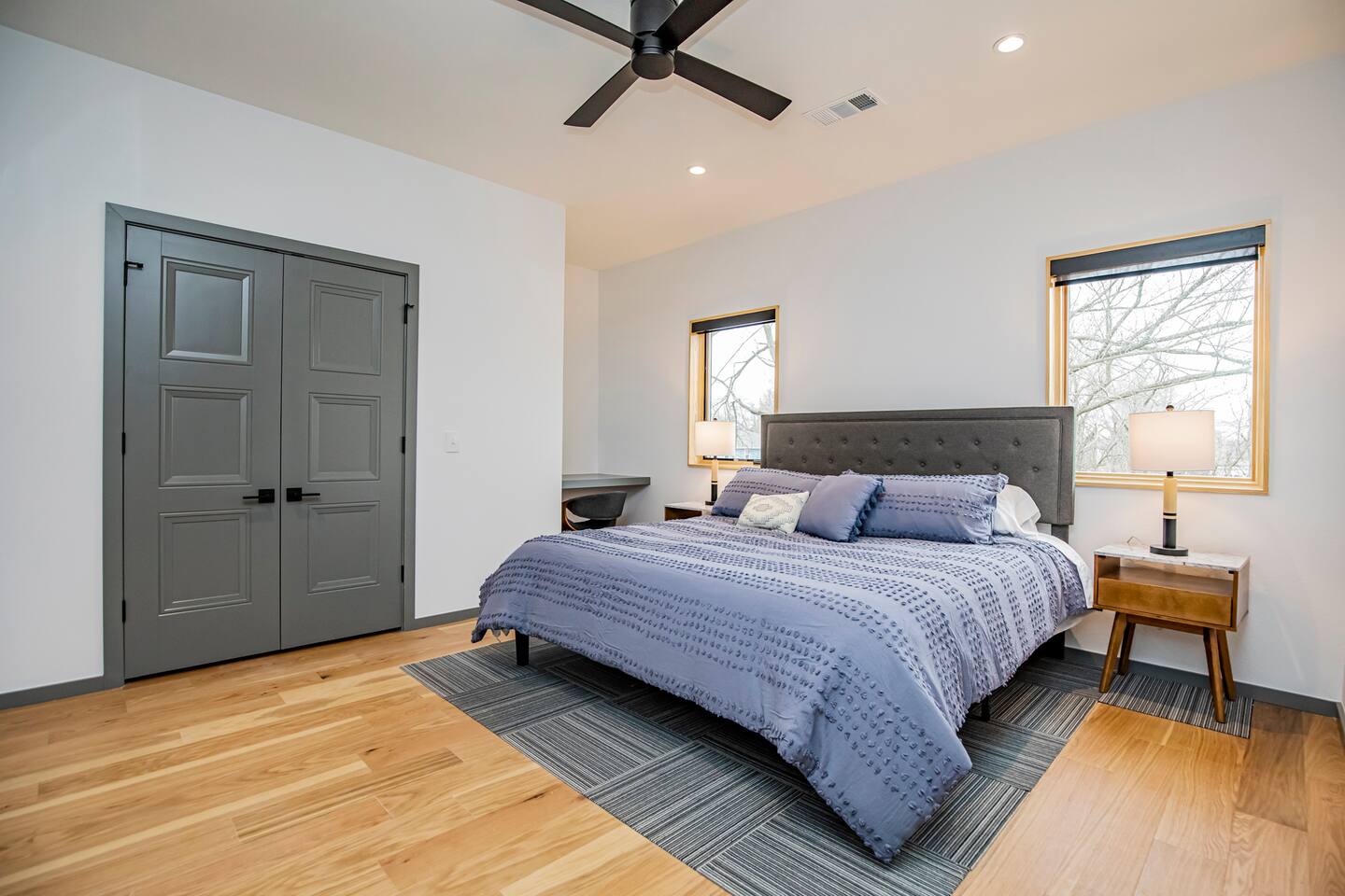 Bike House 2: Modern Trailside Retreat in Bentonville. Ride straight onto Slaughter Pen Trail from your backyard! This 4BR/3.5BA home is perfect for families, riders, and work travelers. Relax in the hot tub, sauna, or by the fire pit after a day of adventure. Enjoy a chef’s kitchen with 36” gas stove and 48” fridge, Smart TVs in every room, EV charger, bike wash station, and large deck with wooded views. Just 1 mile to Downtown and 5 minutes to Crystal Bridges.