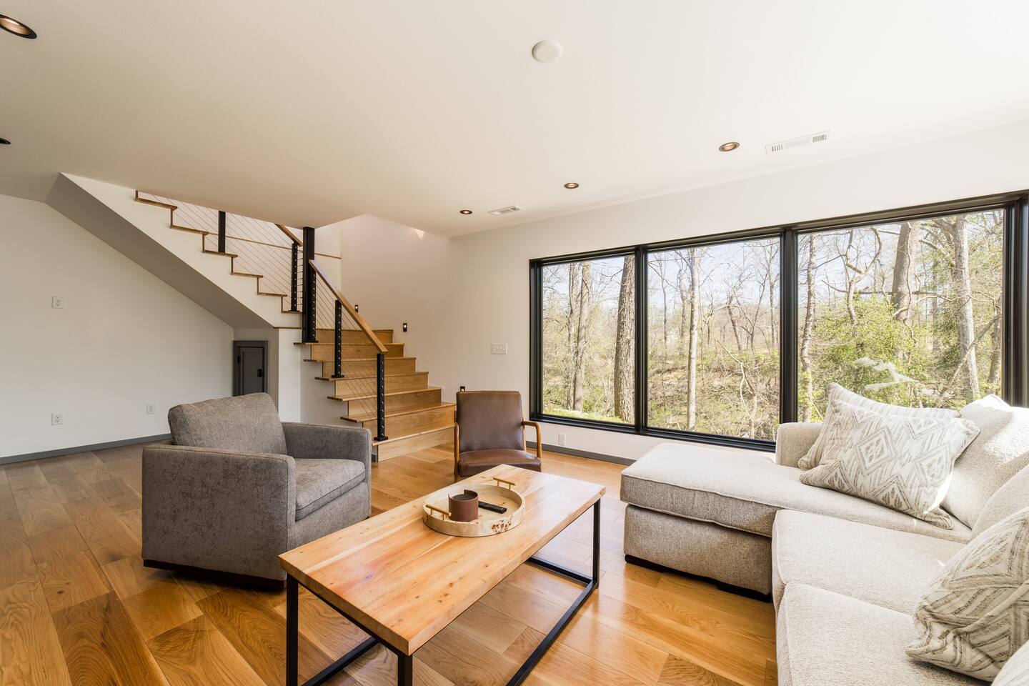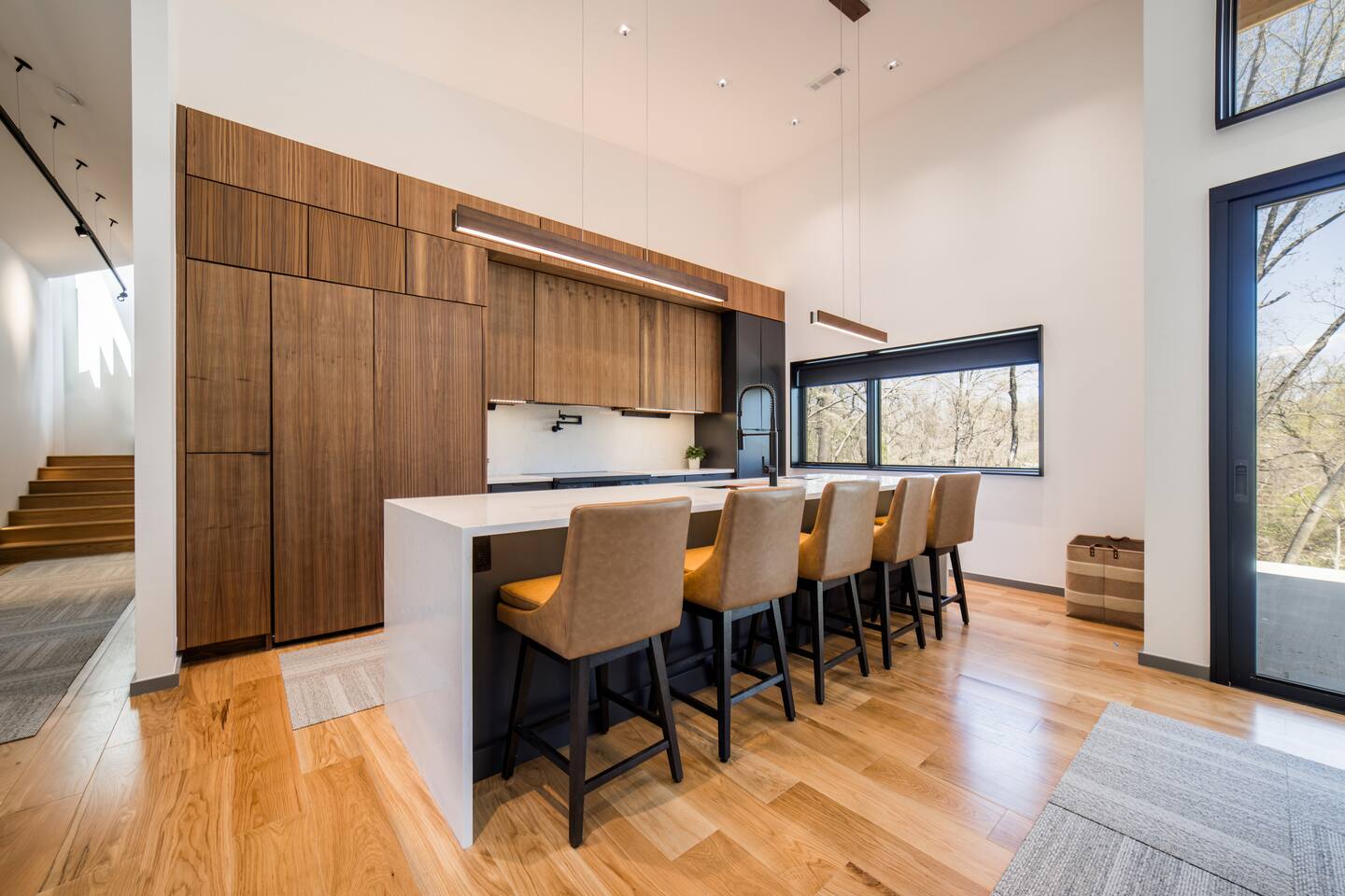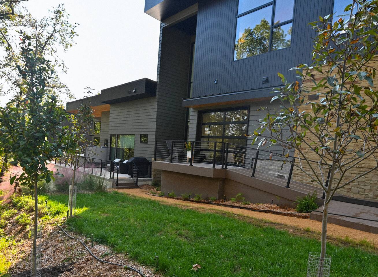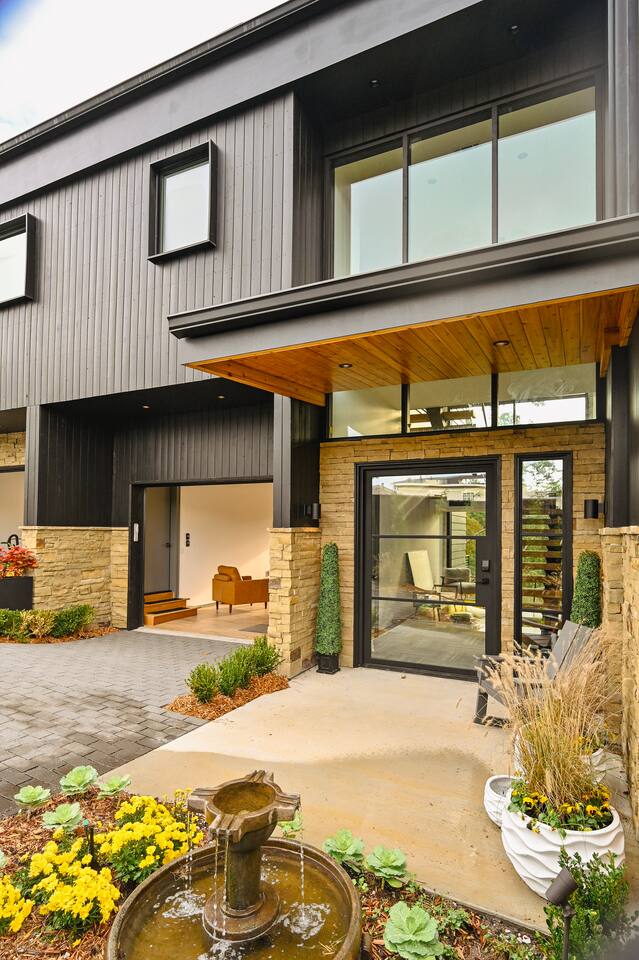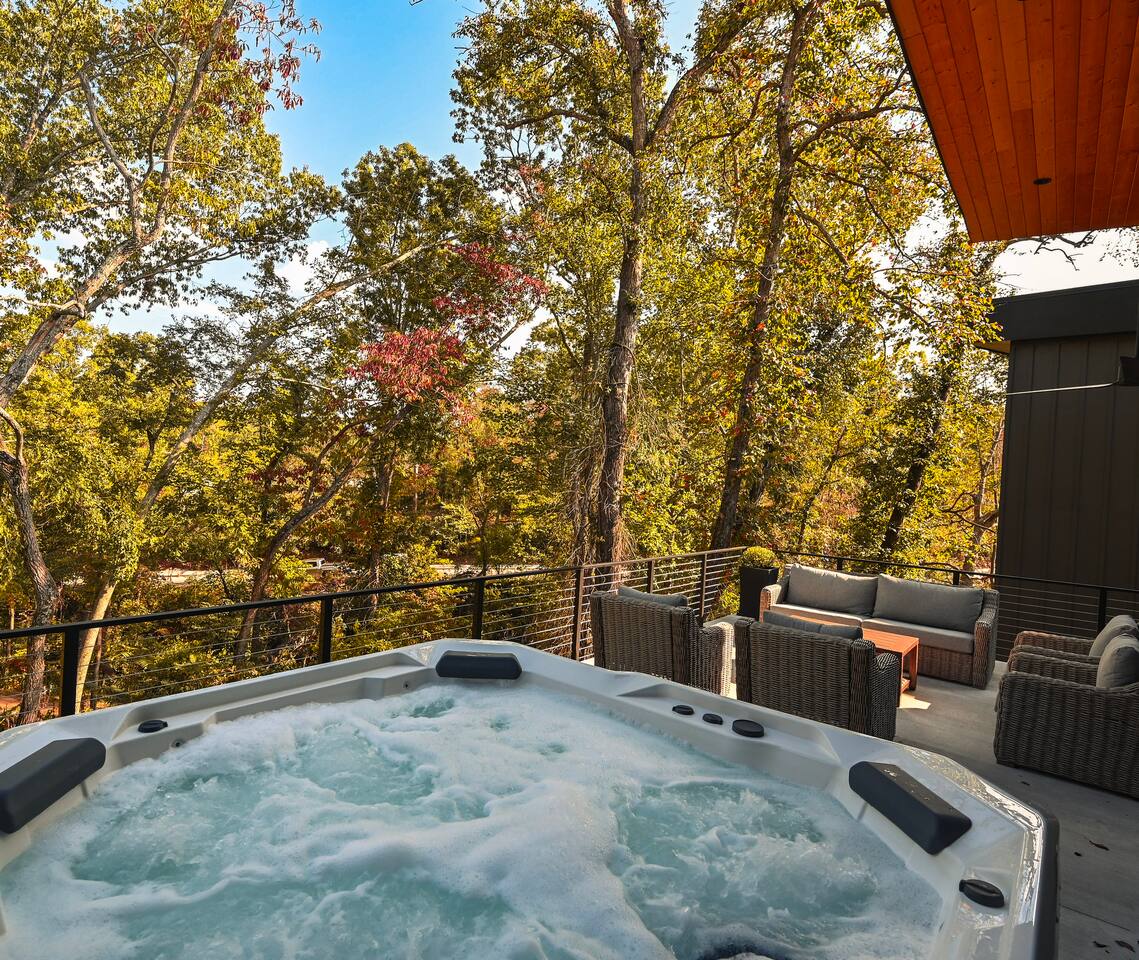 Welcome to Bike House 3—a brand-new, architect-designed 6-bedroom, 6.5-bathroom luxury home available starting August 1st. Located directly on the Slaughter Pen Mountain Bike Trails and just steps from Crystal Bridges Museum, this home offers the closest possible access to Bentonville’s most iconic outdoor and cultural landmarks. With a thoughtful three-part layout and large windows facing the park, trails, and museum, this home is designed to immerse you in nature while providing high-end comfort and privacy for groups, families, or corporate retreats. Main Level: The main house features a full kitchen with island seating, dining area, and living room with an 85" TV. The master suite includes a king bed, private patio access, large windows with park and trail views, and a second 85" TV. Patio doors lead to a covered porch with a hot tub, gas fire pit, grill, dining area, and seating—perfect for relaxing or watching mountain bikers go by. Second Floor: Upstairs includes two bedrooms with king beds, three full bathrooms, and a private living room ideal for separate gatherings. Expansive windows offer seasonal views of Crystal Bridges Museum, the flyover bike bridges, and surrounding trail network. Studio Wing: The Studio Wing is a private retreat with 20-foot ceiling, 18-foot-tall windows, and modern finishes throughout. It includes 2 bedrooms with king beds, loft with 2 twin beds, 2 full bathrooms, a private kitchen, living room, game room, and a spacious basement-level lounge. Ideal for a second family or group, the Studio Wing offers privacy while staying fully connected to the main house. Garage: The home features an oversized 2-car garage with plenty of space for larger vehicles, plus a unique 1-car garage with a glass door that opens onto the deck and park. This flexible space is perfect for entertaining, storing bikes, or setting up games and gatherings with a view. Orientation & Views: The home is positioned to capture views of Boo Boo Trail, the Razorback Greenway, and the north end of Crystal Bridges. Whether inside or outside, you'll enjoy a front-row seat to Bentonville’s trail system, natural beauty, and vibrant biking culture.