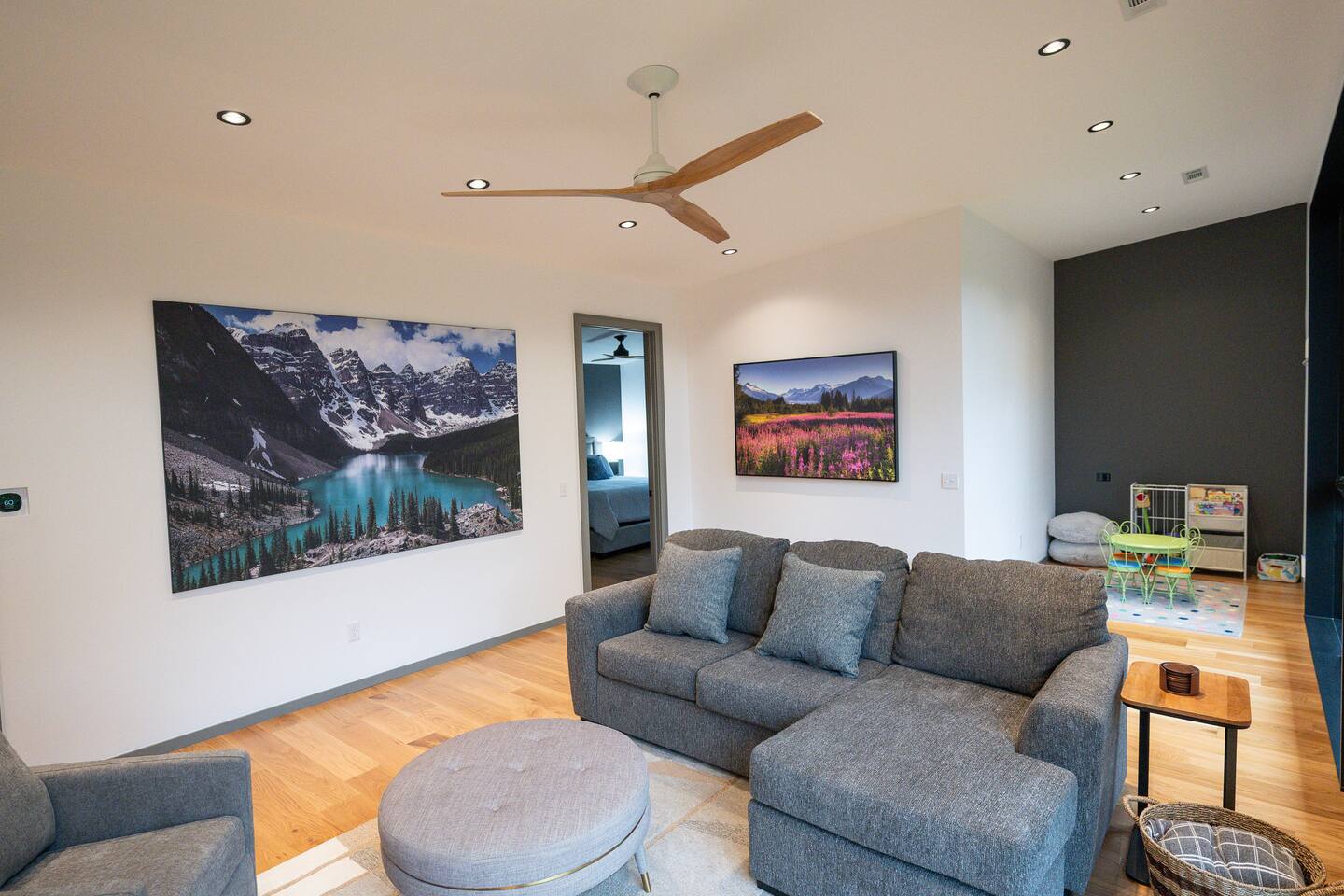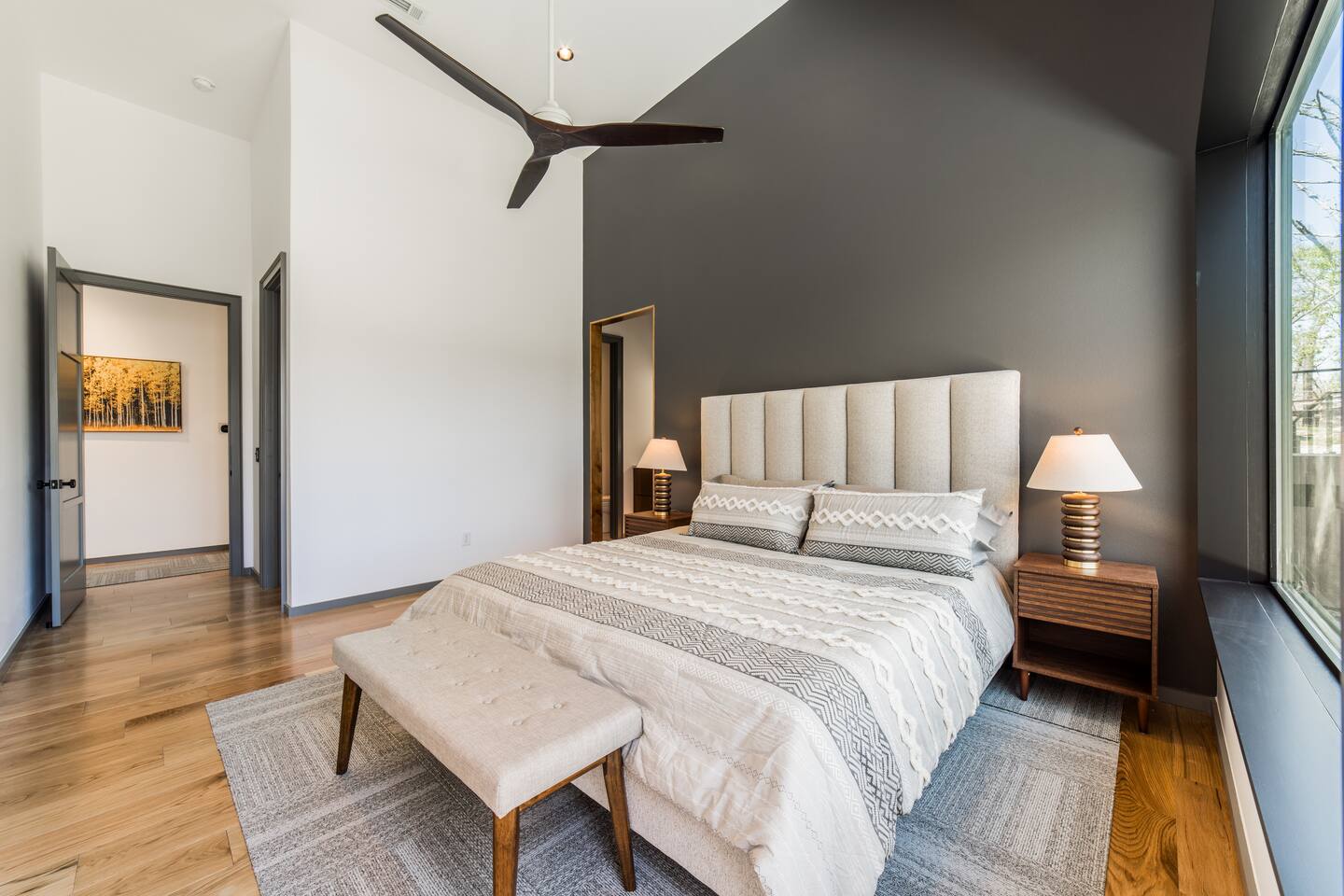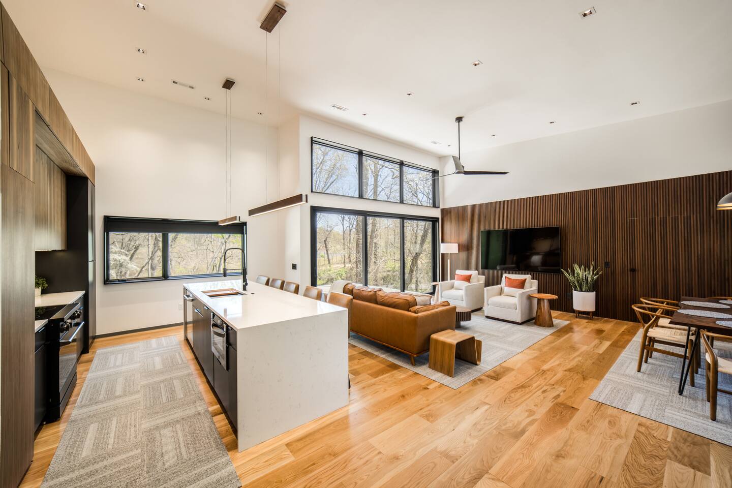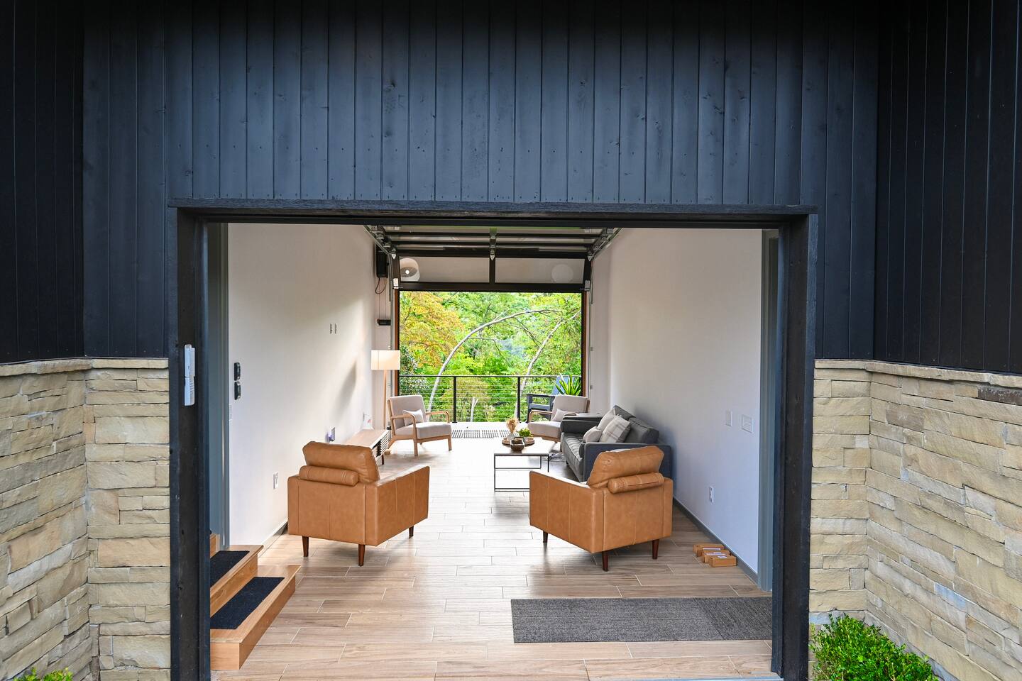 Welcome to Bike House 3—a brand-new, architect-designed 6-bedroom, 6.5-bathroom luxury home available starting August 1st. Located directly on the Slaughter Pen Mountain Bike Trails and just steps from Crystal Bridges Museum, this home offers the closest possible access to Bentonville’s most iconic outdoor and cultural landmarks. With a thoughtful three-part layout and large windows facing the park, trails, and museum, this home is designed to immerse you in nature while providing high-end comfort and privacy for groups, families, or corporate retreats. Main Level: The main house features a full kitchen with island seating, dining area, and living room with an 85" TV. The master suite includes a king bed, private patio access, large windows with park and trail views, and a second 85" TV. Patio doors lead to a covered porch with a hot tub, gas fire pit, grill, dining area, and seating—perfect for relaxing or watching mountain bikers go by. Second Floor: Upstairs includes two bedrooms with king beds, three full bathrooms, and a private living room ideal for separate gatherings. Expansive windows offer seasonal views of Crystal Bridges Museum, the flyover bike bridges, and surrounding trail network. Studio Wing: The Studio Wing is a private retreat with 20-foot ceiling, 18-foot-tall windows, and modern finishes throughout. It includes 2 bedrooms with king beds, loft with 2 twin beds, 2 full bathrooms, a private kitchen, living room, game room, and a spacious basement-level lounge. Ideal for a second family or group, the Studio Wing offers privacy while staying fully connected to the main house. Garage: The home features an oversized 2-car garage with plenty of space for larger vehicles, plus a unique 1-car garage with a glass door that opens onto the deck and park. This flexible space is perfect for entertaining, storing bikes, or setting up games and gatherings with a view. Orientation & Views: The home is positioned to capture views of Boo Boo Trail, the Razorback Greenway, and the north end of Crystal Bridges. Whether inside or outside, you'll enjoy a front-row seat to Bentonville’s trail system, natural beauty, and vibrant biking culture.