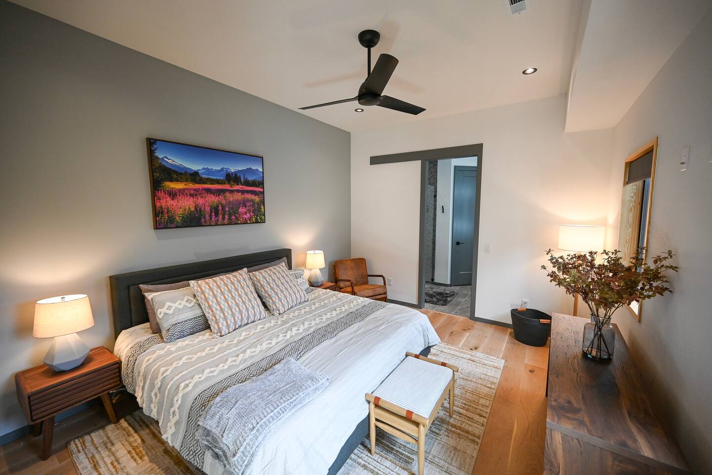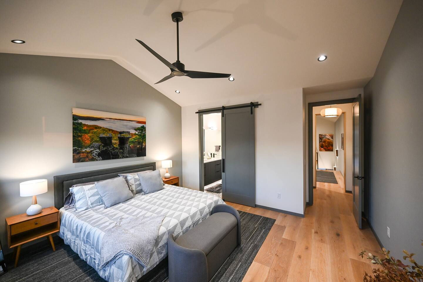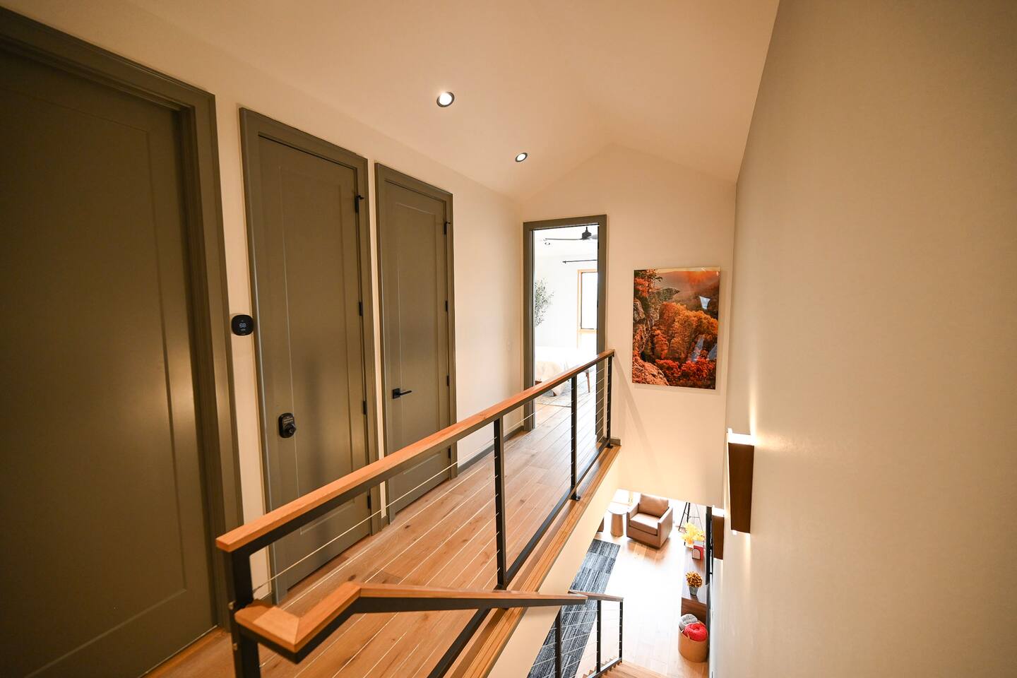 This modern 3-bedroom, 3.5-bathroom home offers a comfortable and convenient base for exploring Bentonville. Located in the same neighborhood as our popular Bike House 1 & 2, you’ll be just 30 seconds from the Tech NAR Mountain Hub and its network of trails, and a quick 5-minute ride to Downtown Square, Crystal Bridges Museum, and the Coler Mountain Bike Preserve. This newly built two-story home is designed for relaxation and easy access to all that Bentonville offers. Whether you’re a family, a group of friends, or a couple seeking a weekend getaway, Downtown Basecamp provides a stylish and well-equipped space for your stay. Comfortable Bedrooms: Three spacious bedrooms each include a king bed with luxurious 700-thread-count sheets and a private attached bathroom for added privacy. The first-floor master suite features a curbless walk-in shower, ideal for guests who prefer fewer stairs. Upstairs bedrooms offer privacy, comfort, and plenty of natural light. Living & Amenities: The open-concept main level includes a modern kitchen with stainless steel appliances, generous counter space, and seating for four at the island. A bright and inviting living area with oversized windows creates a warm, welcoming atmosphere. A small upstairs workspace with a desk provides a quiet place to work or plan your next ride. There’s also a convenient half bath on the main floor and a private deck perfect for grilling or relaxing after a day on the trails. The oversized one-car garage is ideal for storing bikes and gear, with additional parking for two vehicles on the brick apron accessed from the rear alley. Location & Accessibility: A short 5-minute drive, bike ride, or golf cart trip connects you to: Downtown Square – Local shops, dining, and events. Crystal Bridges Museum – World-class art, nature trails, and architecture and Coler Mountain Bike Preserve – Bentonville’s signature biking and outdoor destination.