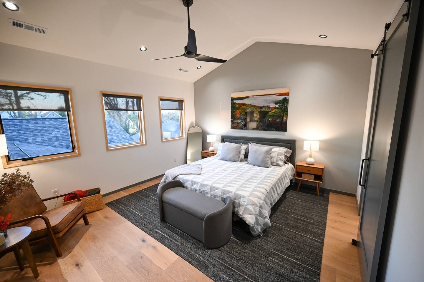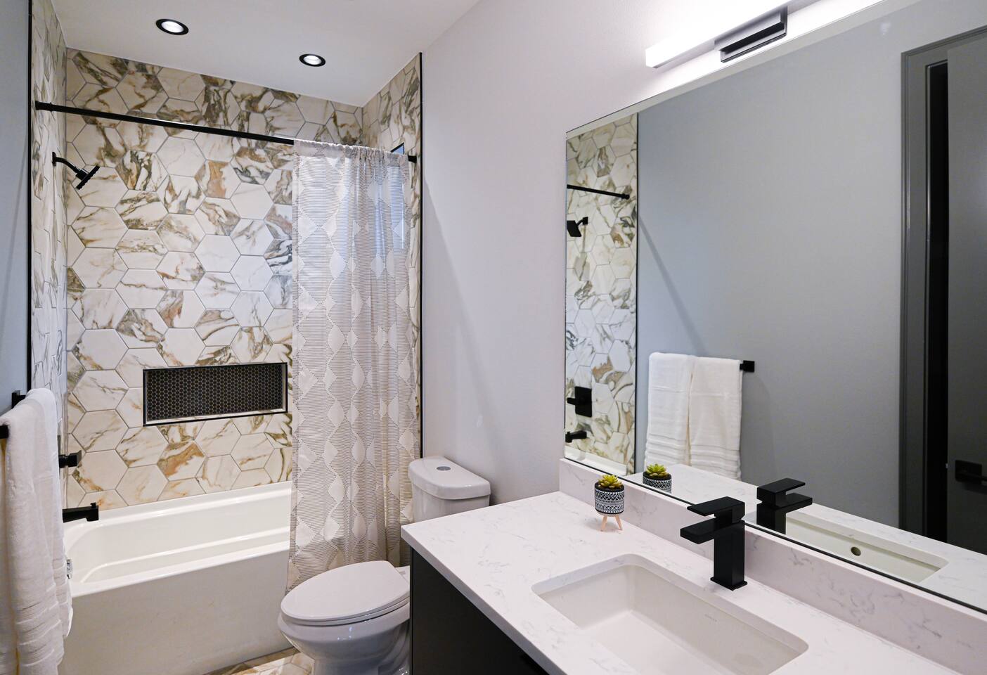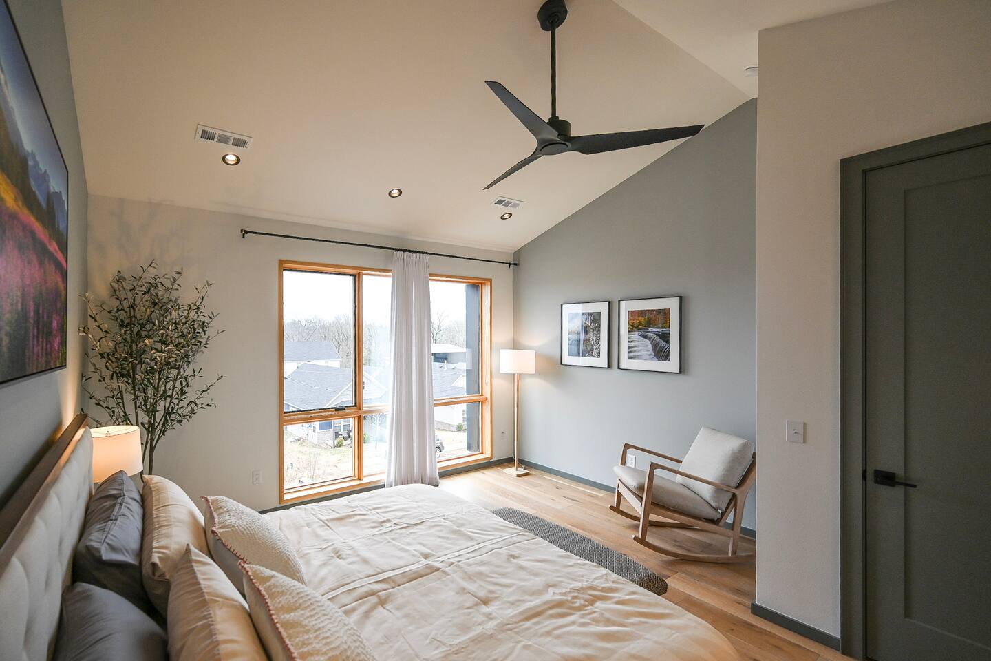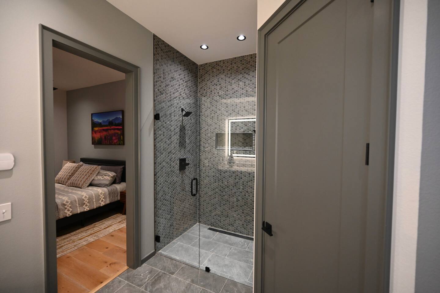 This modern 3-bedroom, 3.5-bathroom home offers a comfortable and convenient base for exploring Bentonville. Located in the same neighborhood as our popular Bike House 1 & 2, you’ll be just 30 seconds from the Tech NAR Mountain Hub and its network of trails, and a quick 5-minute ride to Downtown Square, Crystal Bridges Museum, and the Coler Mountain Bike Preserve. This newly built two-story home is designed for relaxation and easy access to all that Bentonville offers. Whether you’re a family, a group of friends, or a couple seeking a weekend getaway, Downtown Basecamp provides a stylish and well-equipped space for your stay. Comfortable Bedrooms: Three spacious bedrooms each include a king bed with luxurious 700-thread-count sheets and a private attached bathroom for added privacy. The first-floor master suite features a curbless walk-in shower, ideal for guests who prefer fewer stairs. Upstairs bedrooms offer privacy, comfort, and plenty of natural light. Living & Amenities: The open-concept main level includes a modern kitchen with stainless steel appliances, generous counter space, and seating for four at the island. A bright and inviting living area with oversized windows creates a warm, welcoming atmosphere. A small upstairs workspace with a desk provides a quiet place to work or plan your next ride. There’s also a convenient half bath on the main floor and a private deck perfect for grilling or relaxing after a day on the trails. The oversized one-car garage is ideal for storing bikes and gear, with additional parking for two vehicles on the brick apron accessed from the rear alley. Location & Accessibility: A short 5-minute drive, bike ride, or golf cart trip connects you to: Downtown Square – Local shops, dining, and events. Crystal Bridges Museum – World-class art, nature trails, and architecture and Coler Mountain Bike Preserve – Bentonville’s signature biking and outdoor destination.