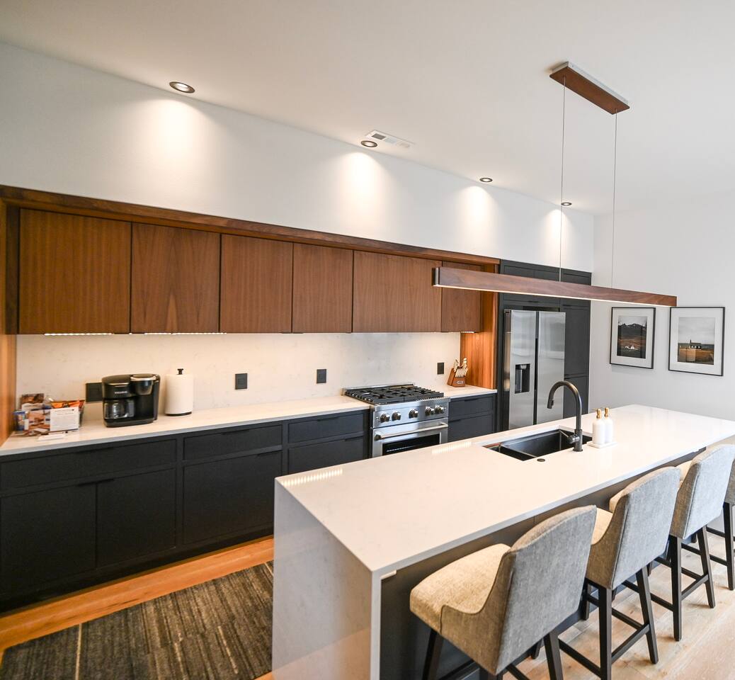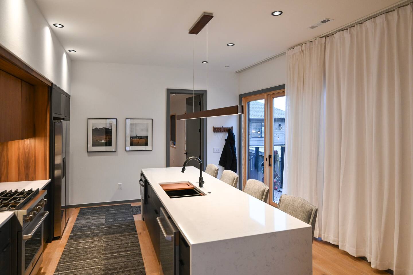 This property does not have a dining room table due to the design layout. However, the kitchen island comfortably seats four guests.